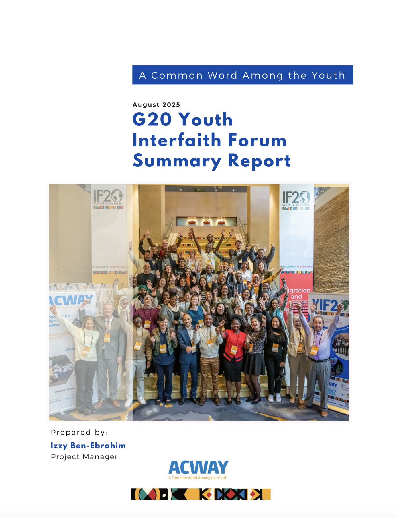 In August 2025, ACWAY hosted the Youth Interfaith Forum (YIF20) in Cape Town, South Africa, in partnership with the G20 Interfaith Forum and global organisations including the United Religions Initiative, Charter for Compassion, and the Network for Religious and Traditional Peacemakers. The Forum brought together young leaders, faith practitioners, educators, and civic actors from across the world to strengthen interfaith collaboration and youth leadership.