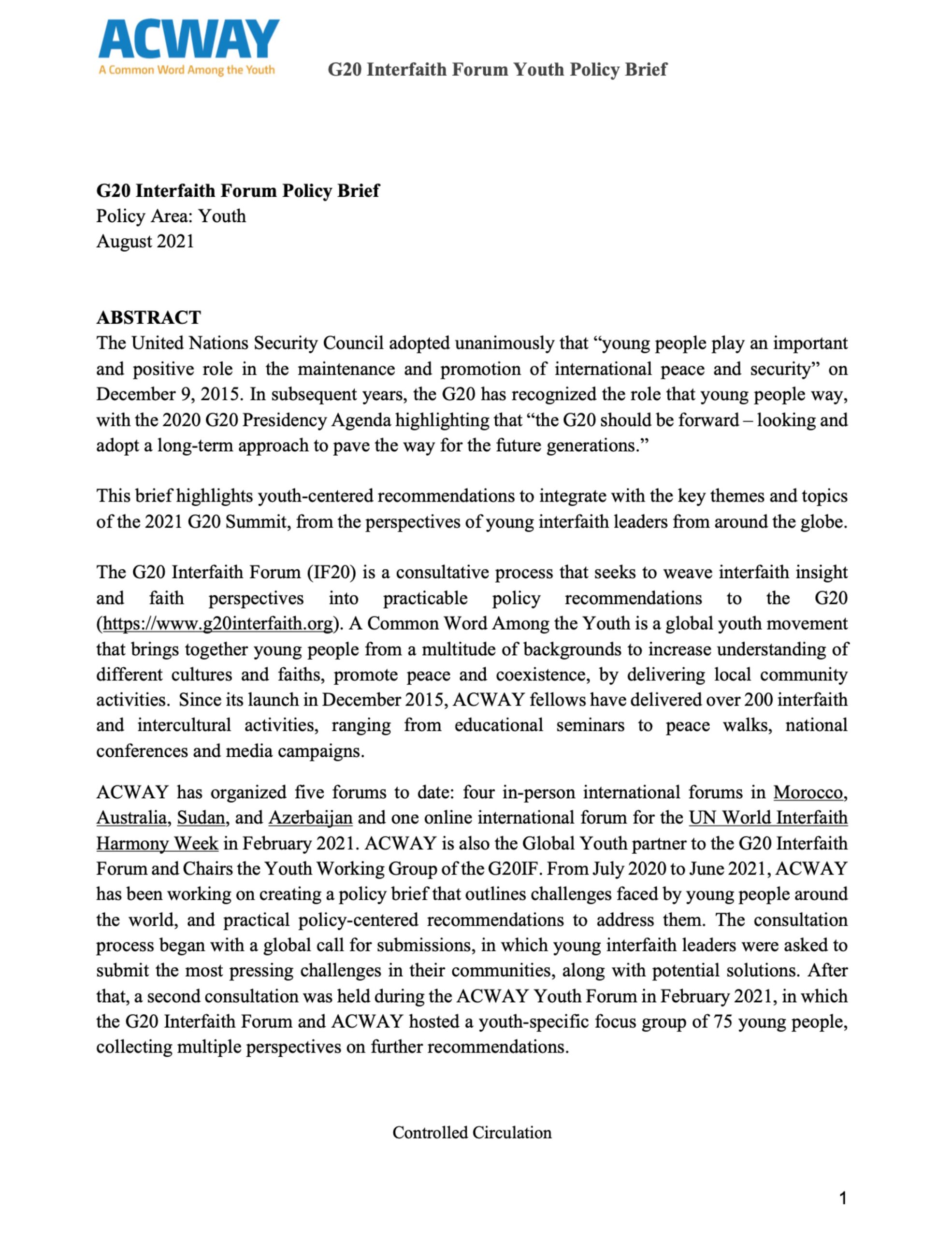 The G20 Interfaith Forum Youth Policy Brief presents a global youth-led perspective on key challenges and policy priorities ahead of the G20 Summit. Developed by ACWAY in collaboration with young interfaith leaders worldwide, the brief highlights the critical role of youth in promoting peace, social cohesion, and sustainable development.