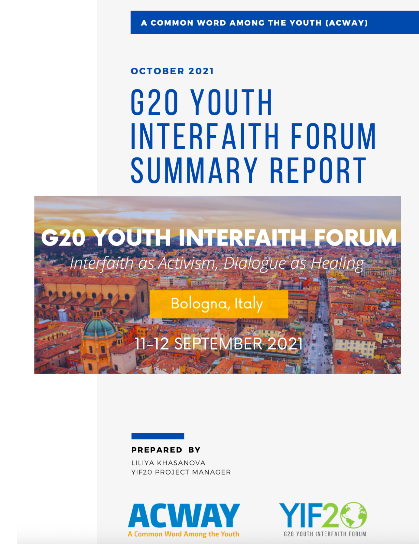 This report documents the inaugural G20 Youth Interfaith Forum (YIF20), held in Bologna, Italy in September 2021. Organized by A Common Word Among the Youth (ACWAY) as Global Youth Partner to the G20 Interfaith Forum, the event brought together 47 young interfaith practitioners from 30 countries and 12 faith traditions.